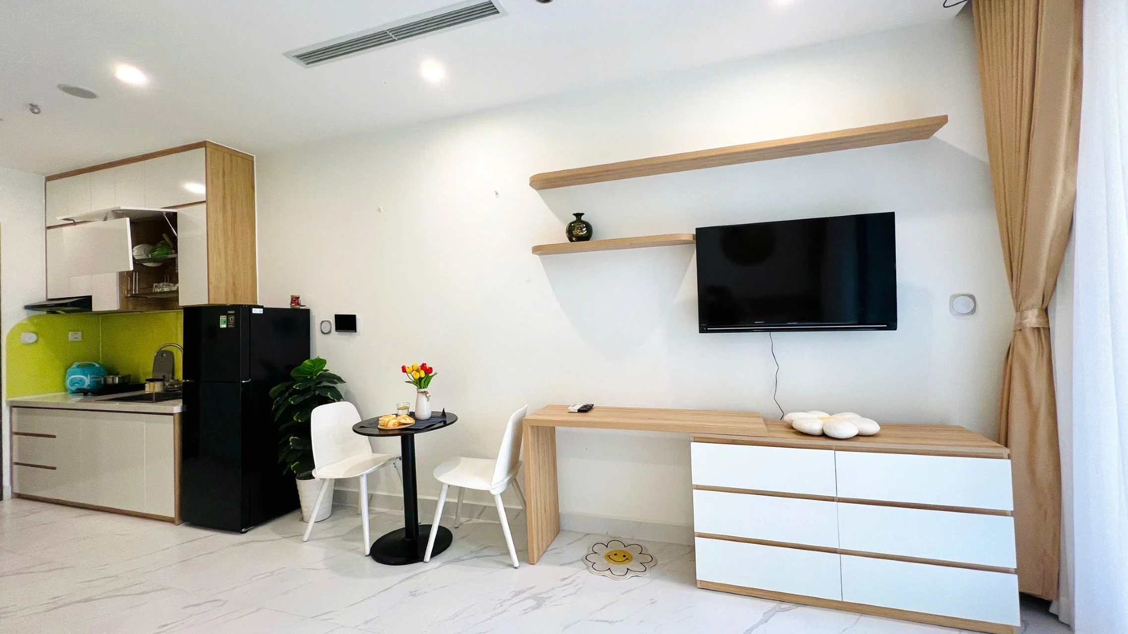 Không gian studio tông trắng – gỗ ấm áp, thiết kế hiện đại tối giản, bố trí giường lớn êm ái, sofa thư giãn và khu bếp gọn gàng, tạo cảm giác sạch