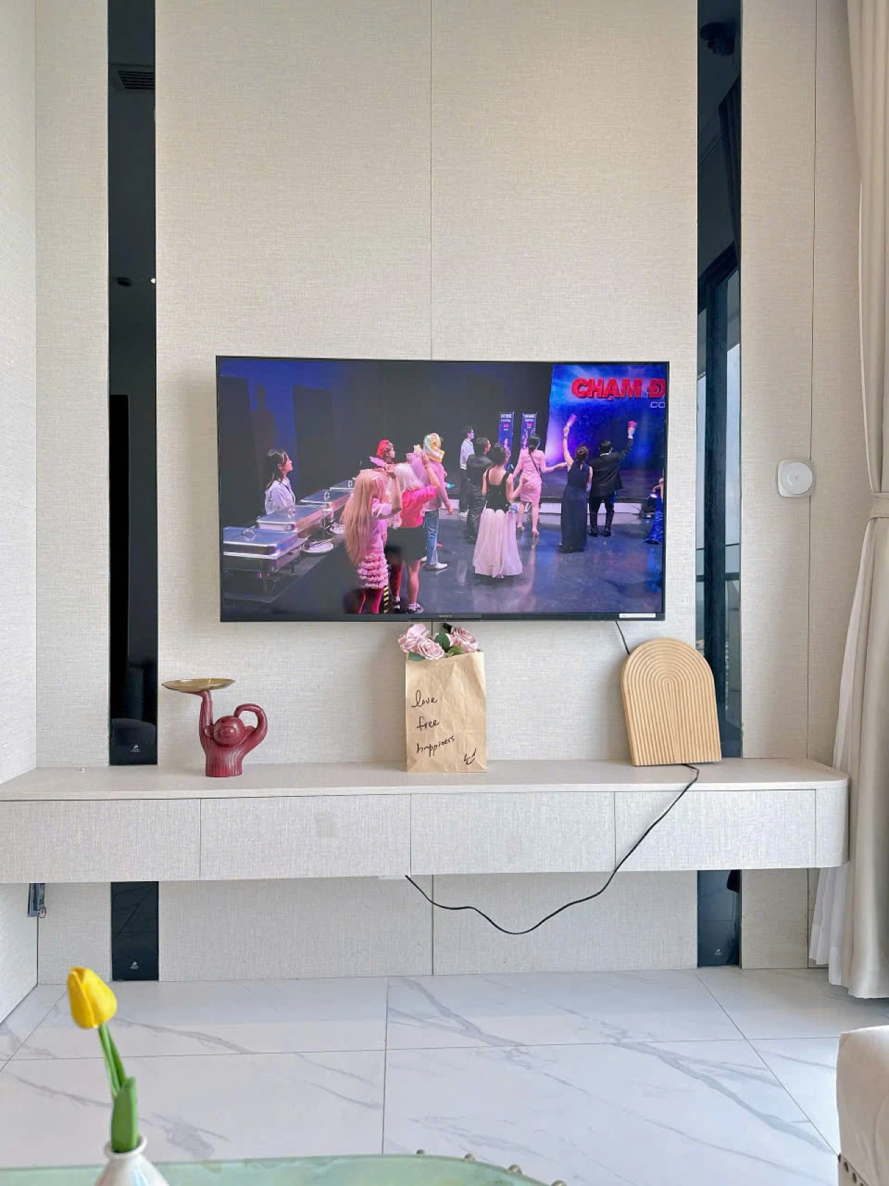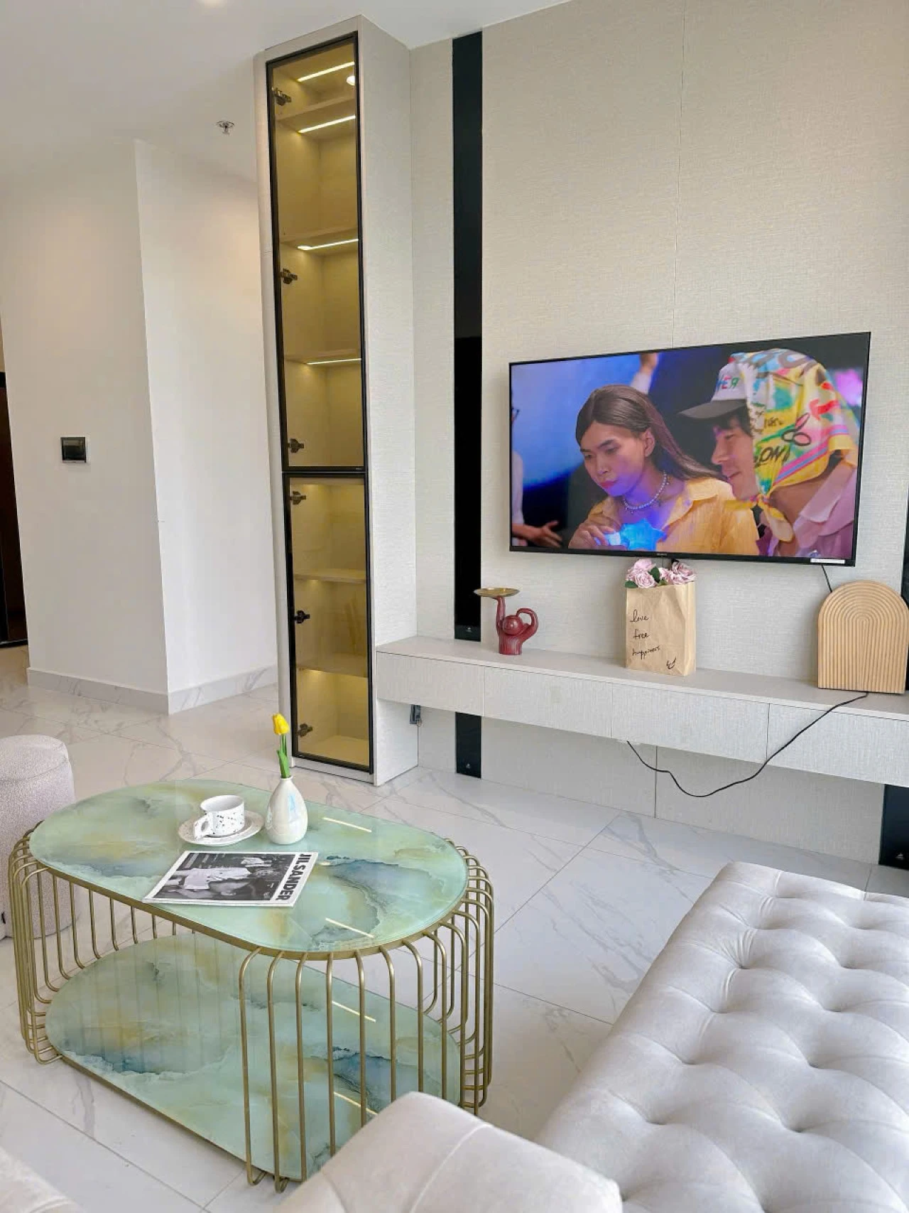 Không gian phòng khách sang trọng, sofa êm ái, TV màn hình lớn và bàn trà tinh tế – lý tưởng để thư giãn sau một ngày dài.